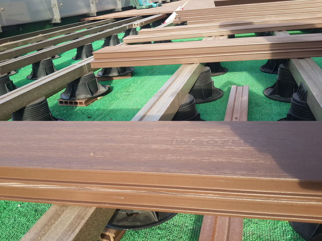 Для ее обустройства использовались регулируемые опоры NewMaxi, лаги из ДПК, доска террасная WOOZEN для финишной отделки крыши. Отличительной особенностью террасных досок является возможность укладки ее под разными направлениями для преломления лучей света и создания на эксплуатируемой поверхности стильного, оригинального узора.
